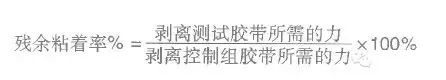 殘余接著強(qiáng)度指壓敏膠面材在指定條件下與硅酮離型底材先接觸,之后將其貼在標(biāo)準(zhǔn)測(cè)試板上制成標(biāo)準(zhǔn)測(cè)試片,之后在固定的剝離角度、速度下,從標(biāo)準(zhǔn)試片上將其剝離時(shí)所需要的力。而殘余接著率是以百分比表示的,是將上述壓敏膠面材殘余粘著強(qiáng)度比上同一面材在不接觸硅酮離型底材前提下與標(biāo)準(zhǔn)測(cè)試版貼合所產(chǎn)生的粘著強(qiáng)度的比值。